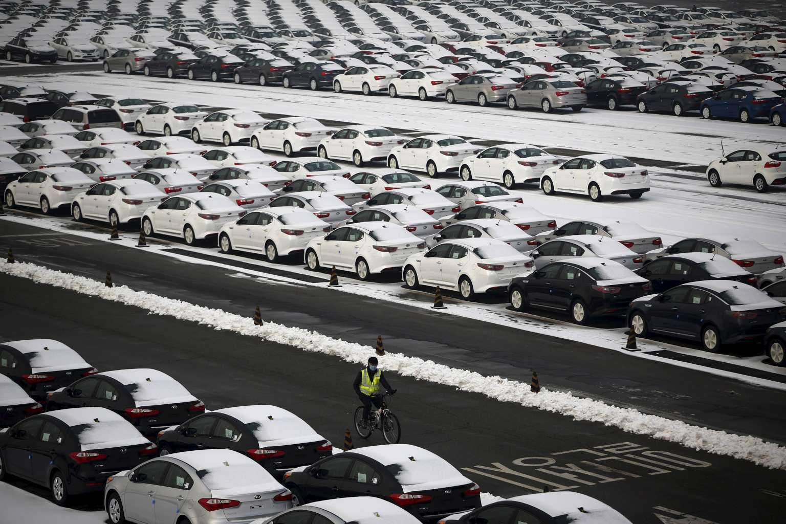 A worker cycles past cars made by South Korean automakers Hyundai Motor and affiliate Kia Motors.