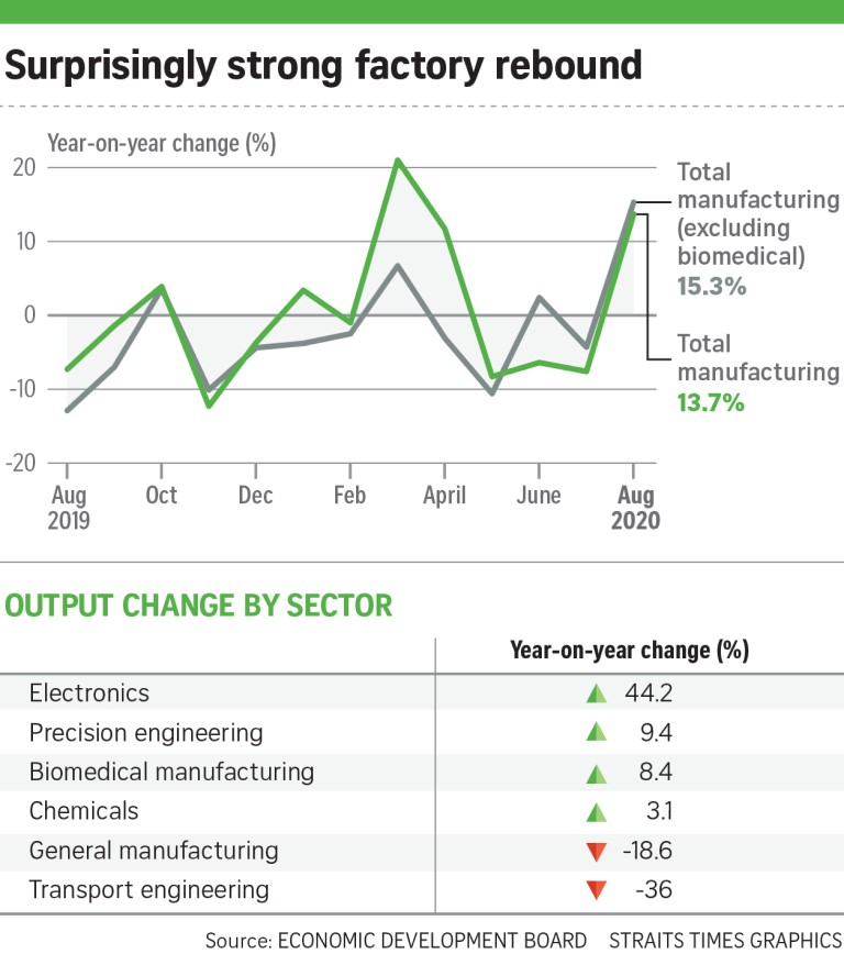 United Overseas Bank economist Barnabas Gan noted that key reasons for the output surge last month were a relatively low base from last year, and demand for biomedical goods, digital solutions and semiconductor equipment.