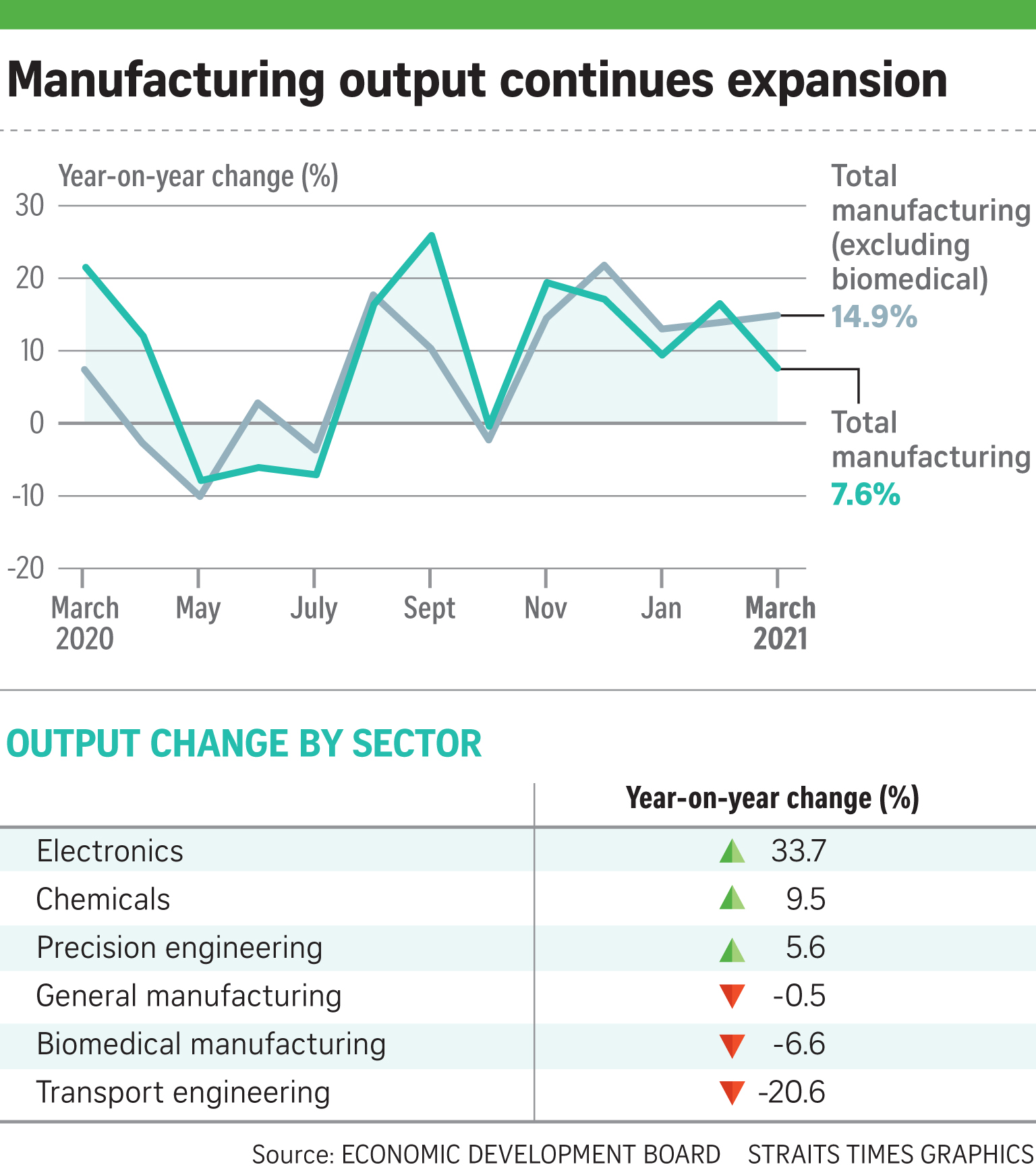 Excluding biomedical manufacturing, March output grew 14.9 per cent year on year but fell 3.2 per cent month on month.