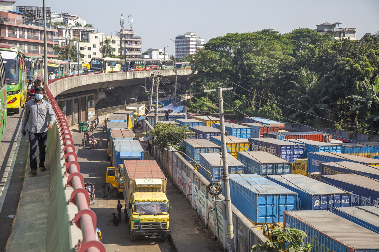 Covered vans and trucks parked on the truck stand during the nationwide strike at the Tikatuli truck stand in Dhaka on Nov 8, 2021.