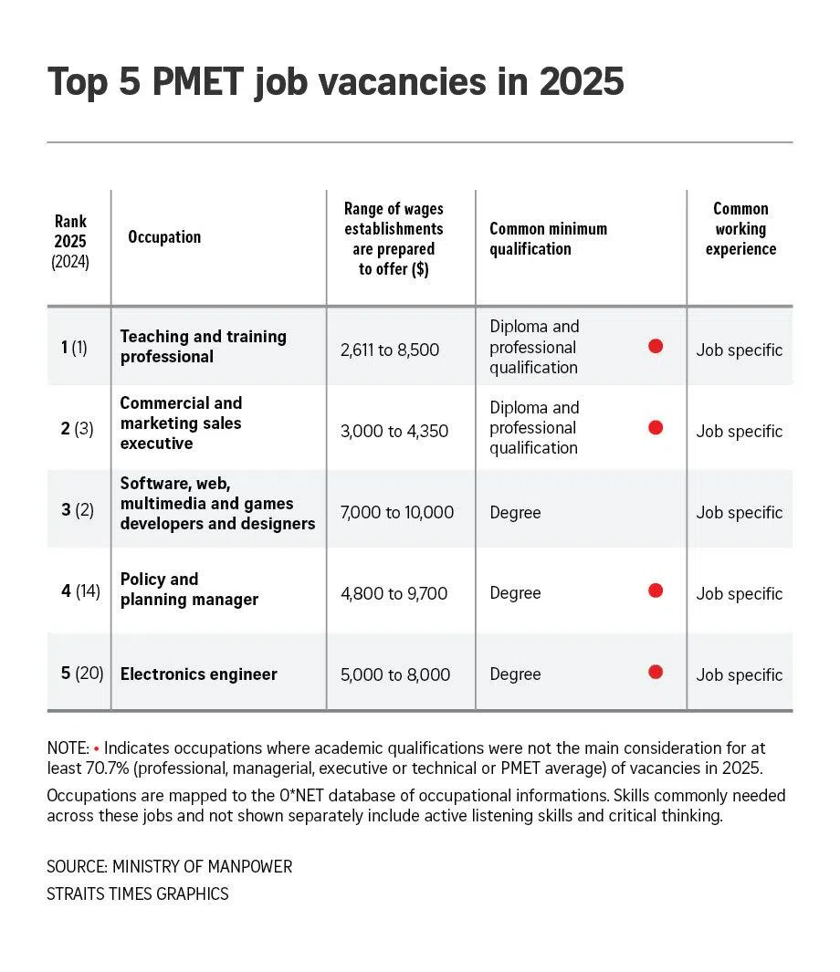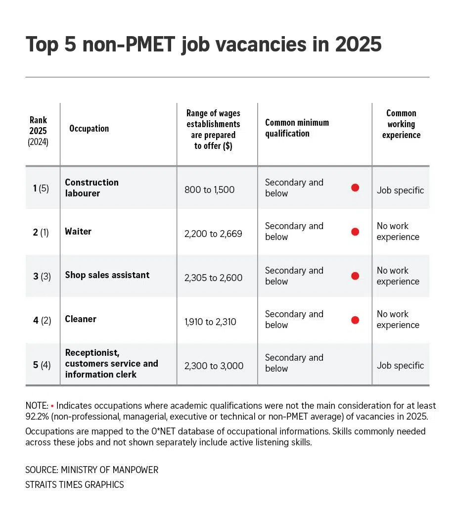 The ministry noted employers are increasingly looking beyond academic qualifications, citing better outcomes like faster hiring and improved employee performance. Close to 80 per cent of vacancies do not place academic qualifications as the main criterion, said the ministry. This was a further increase from 78.8 per cent in 2024.