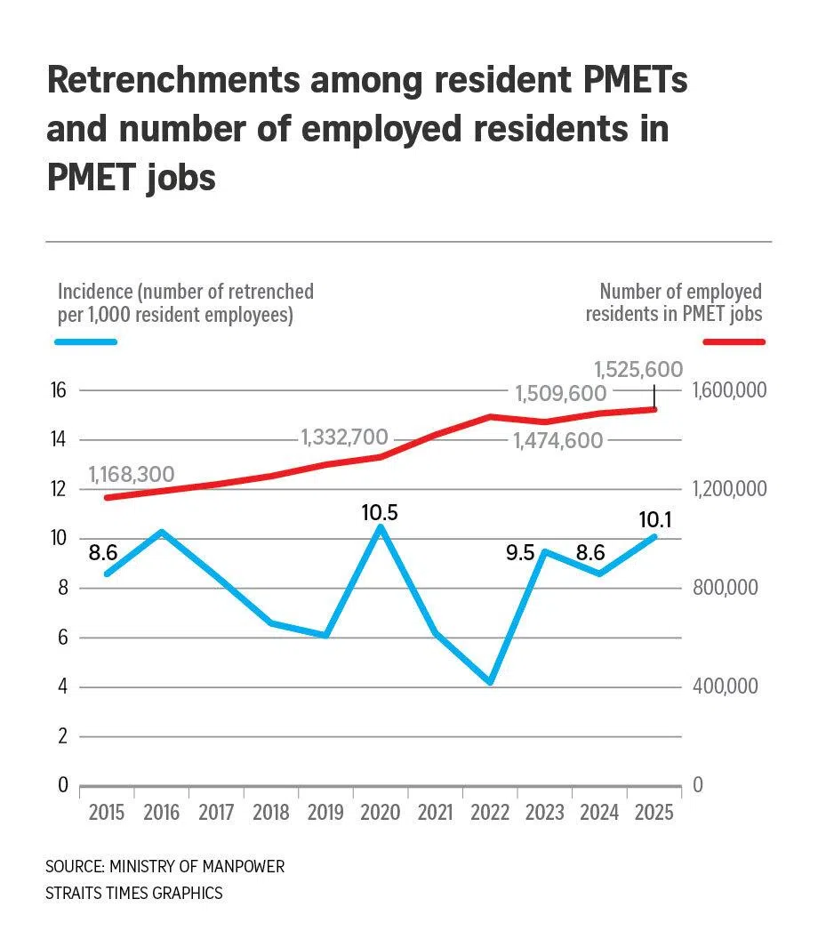 In 2025, the rate of retrenchment among Singaporeans and permanent resident PMETs rose to 10.1 per 1,000 employees - the highest recorded since 2021. The highest rate of retrenchment was 10.5 in 2020.
