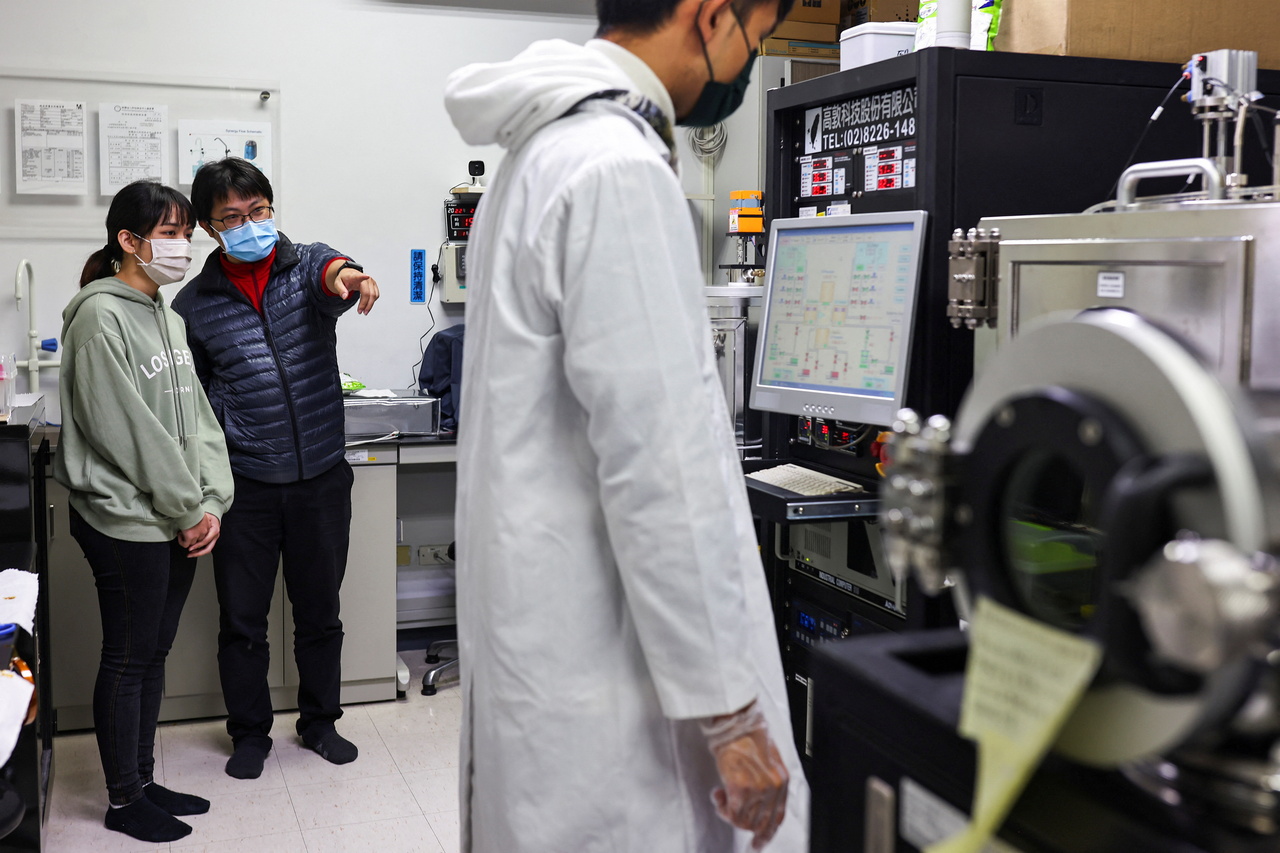 A staff at the National Cheng Kung University introduces a new incoming master student of the Smart Semiconductor and Sustainable Manufacturing College inside a lab in Tainan, Taiwan, February 22, 2022.