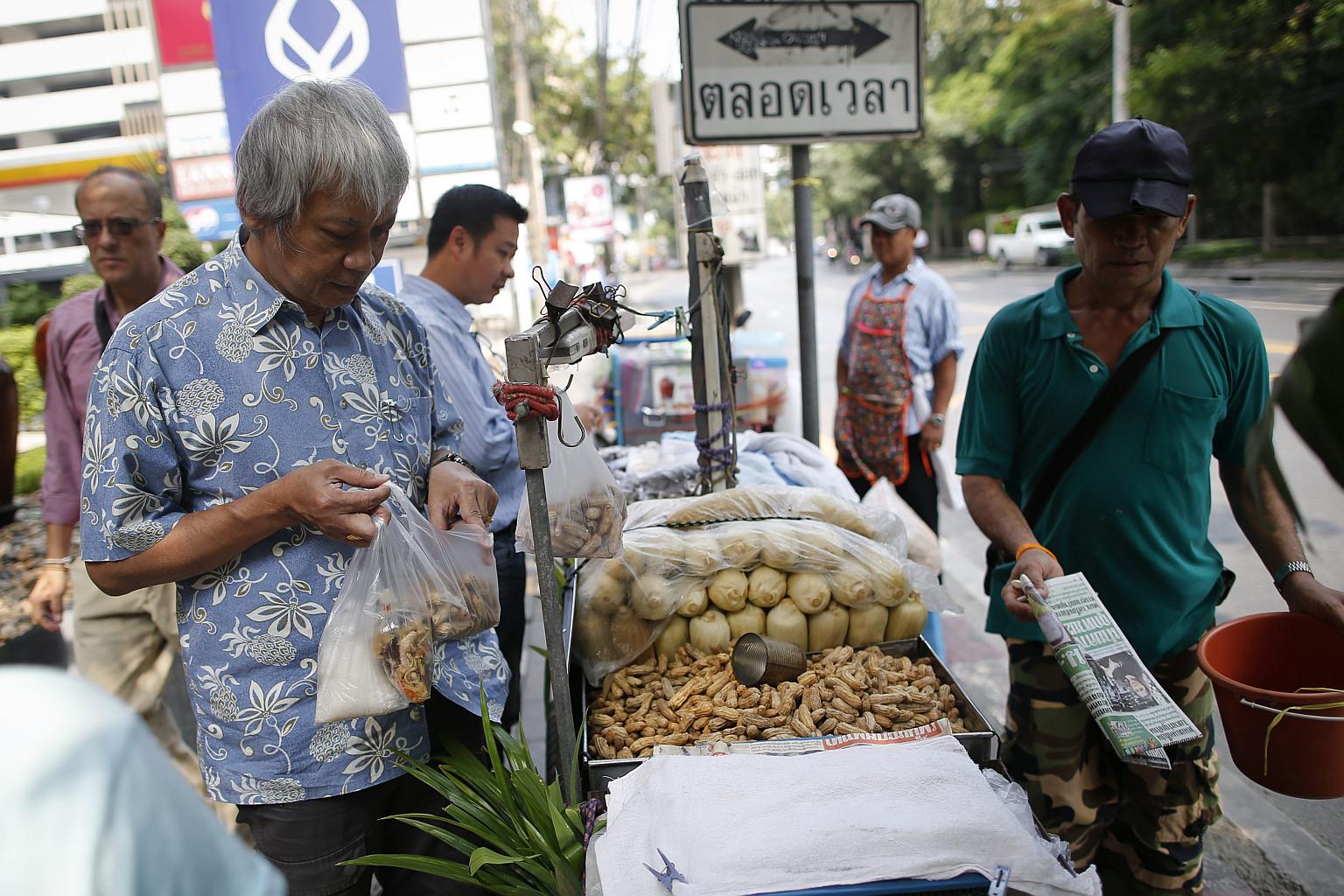 A man buys peanuts from a food vendor on a sidewalk in Bangkok, Thailand, on Feb 1, 2016.