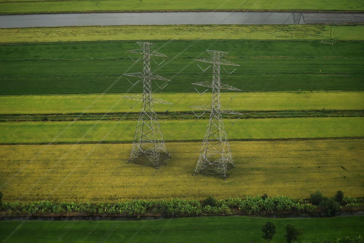 An aerial view of agricultural areas with rice paddies and electricity pylons in the Thai province of Chachoengsao, on Aug 6, 2019.