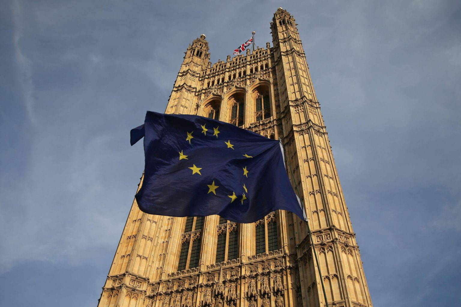 A European Union flag flutters in front of London's Victoria Tower, on Feb 13, 2019.
