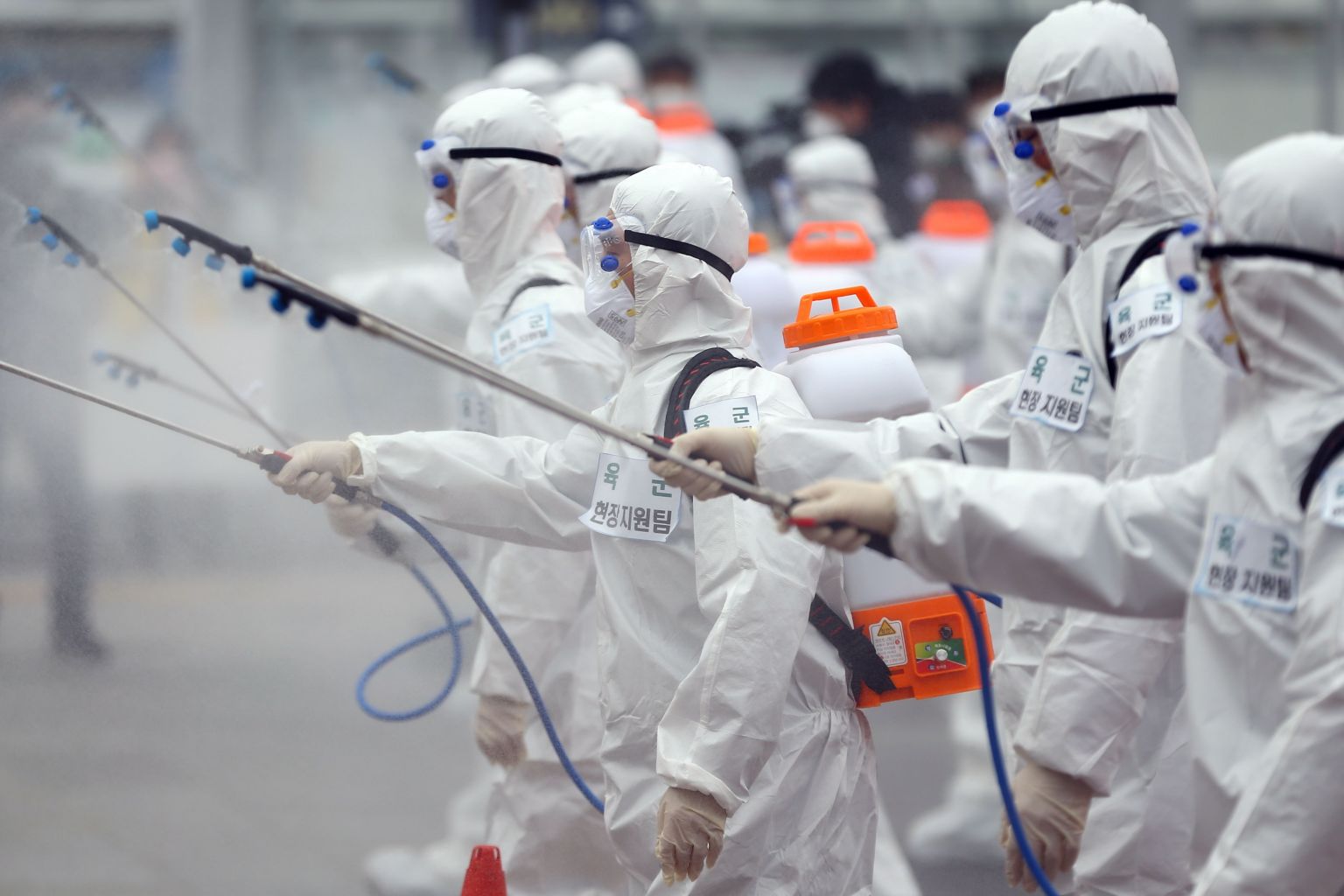 South Korean soldiers wearing protective gear spray disinfectant at Dongdaegu railway station in Daegu on Feb 29, 2020.