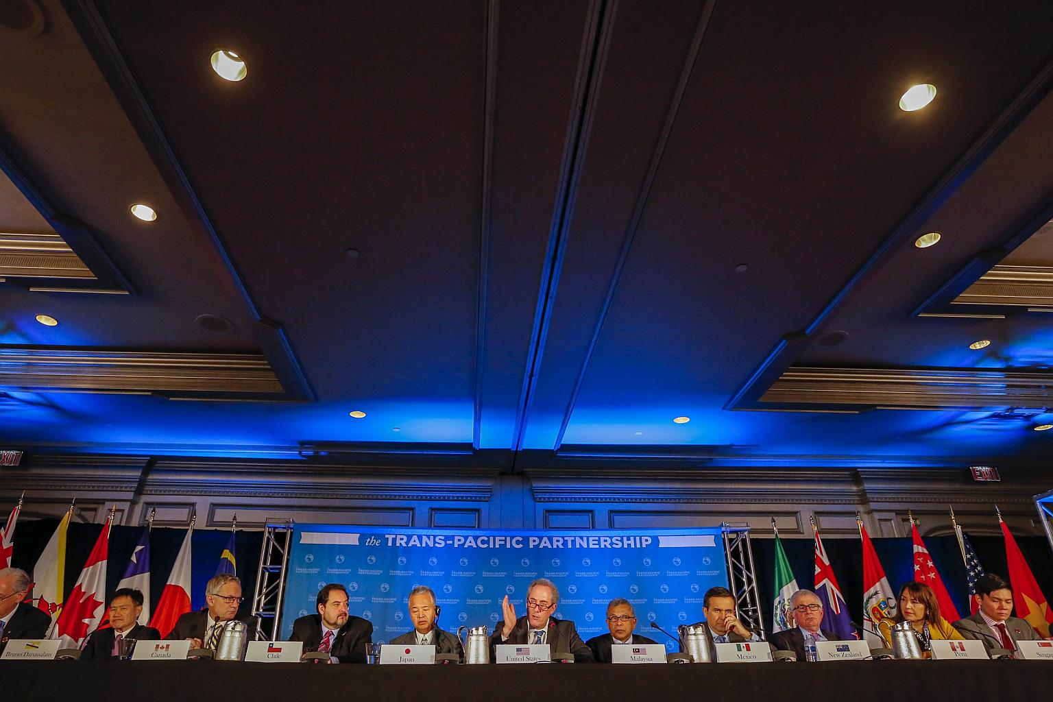 Trade ministers from the twelve Trans-Pacific Partnership (TPP) member countries participate in the closing press conference in Atlanta, Georgia, USA, Oct 5, 2015.