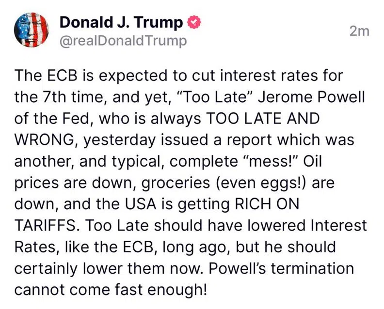 Mr Trump’s earlier post suggested Mr Powell’s decisions were “Too Late” and that he should have followed the European Central Bank’s (ECB) lead, which on April 17  lowered its benchmark deposit rate