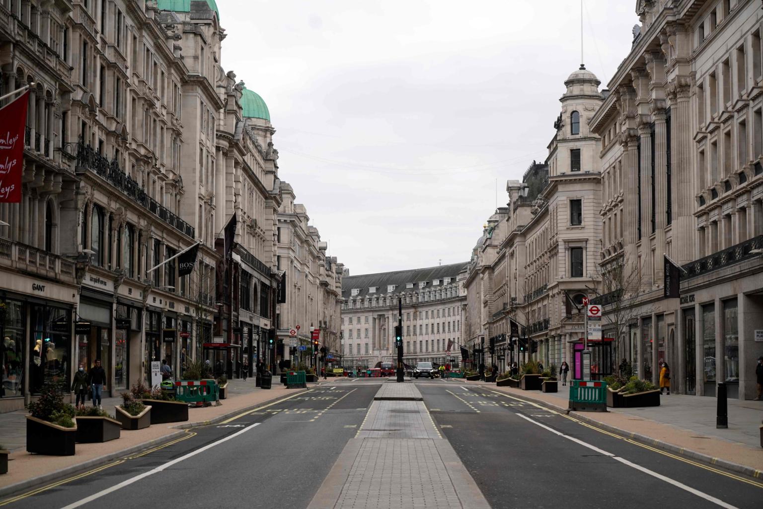 A near-deserted Regent Street in London last month. Non-essential shops and outdoor hospitality venues reopened on Monday.