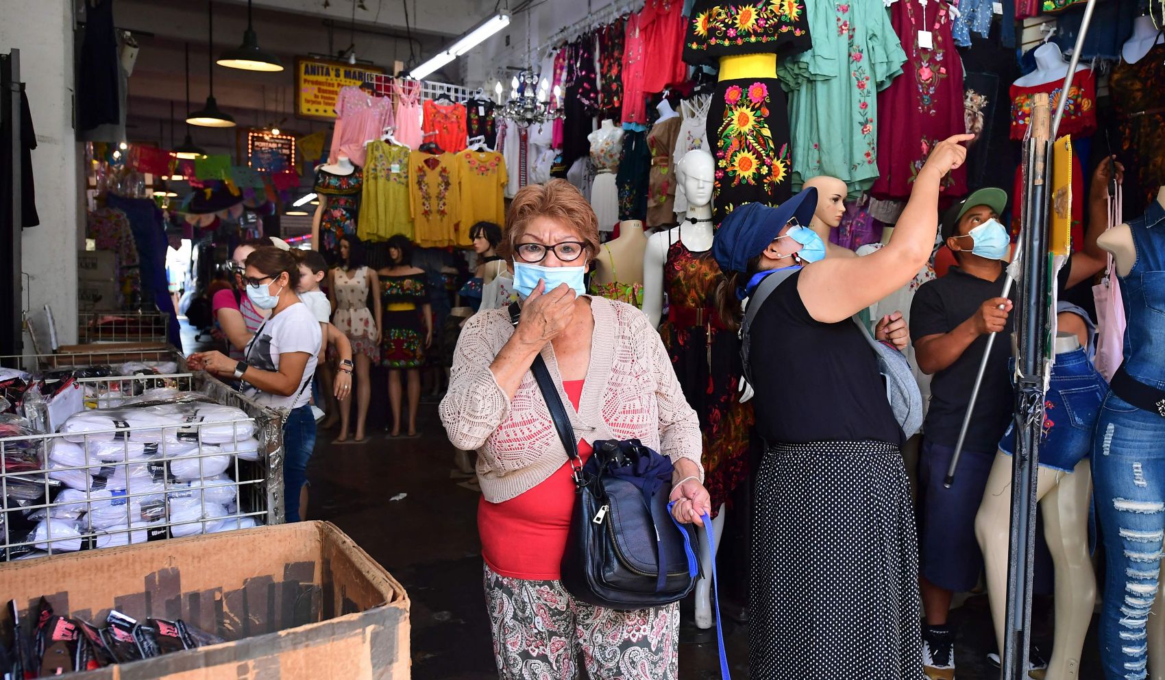 A woman adjusts her face mask while shopping at a clothing store in Los Angeles, California, in July 2021.