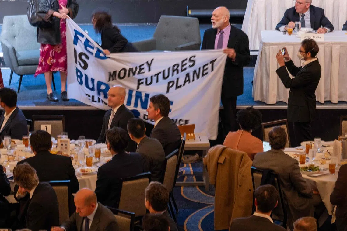 Climate activists disrupting Federal Reserve chairman Jerome Powell’s appearance at the event, which is hosted by the Economic Club of New York.