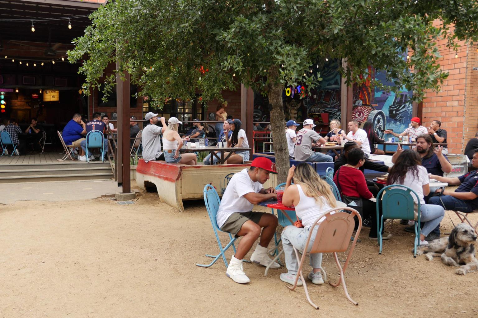 Diners at Truck Yard beer garden in Houston, Texas, on April 9, 2021.