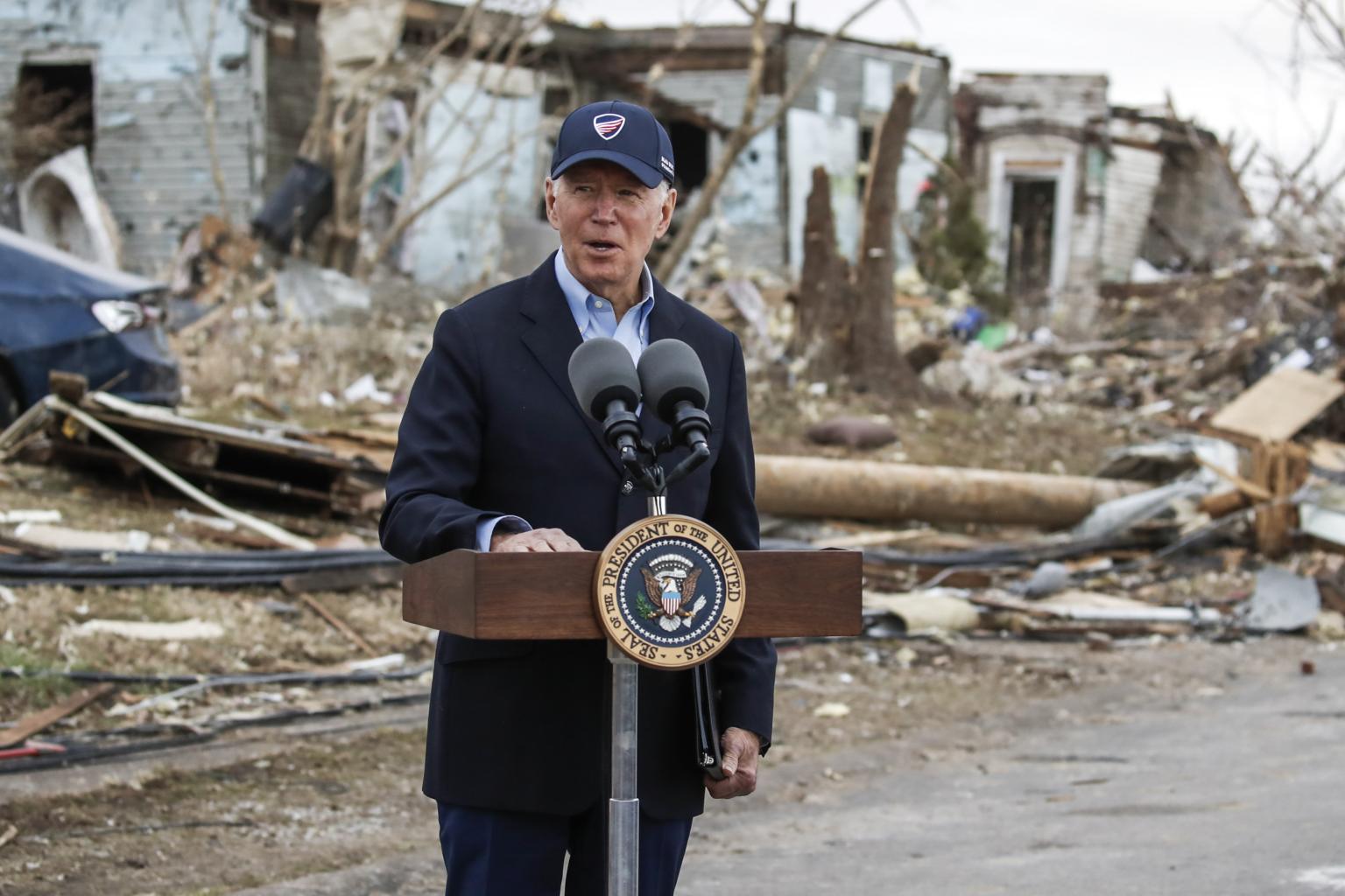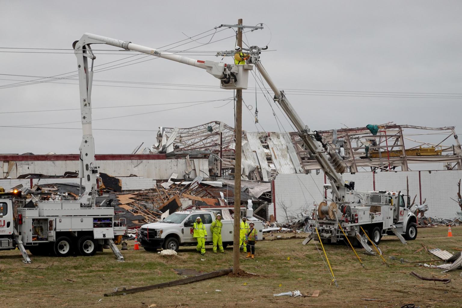 Linemen work to restore power to residents in Kentucky on Dec 16, 2021.