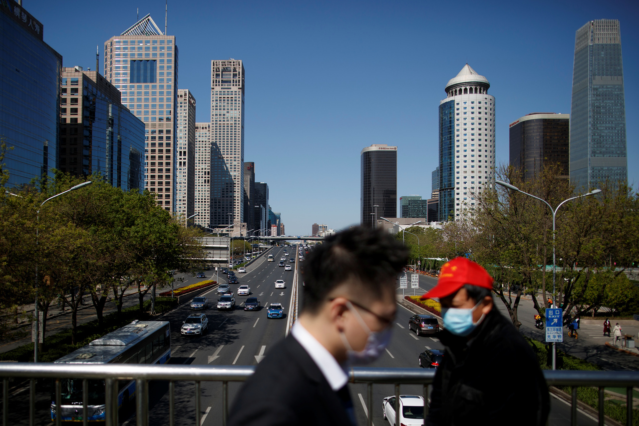 People cross a bridge at the Central Business District in Beijing on April 22, 2020.