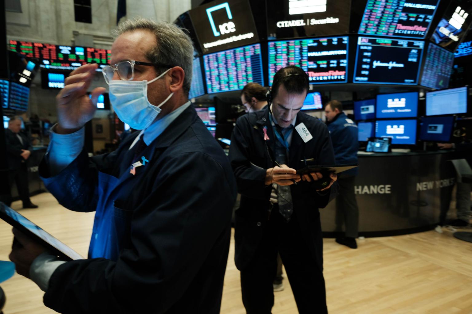 Traders, some in medical masks, work on the floor of the New York Stock Exchange on March 20, 2020.
