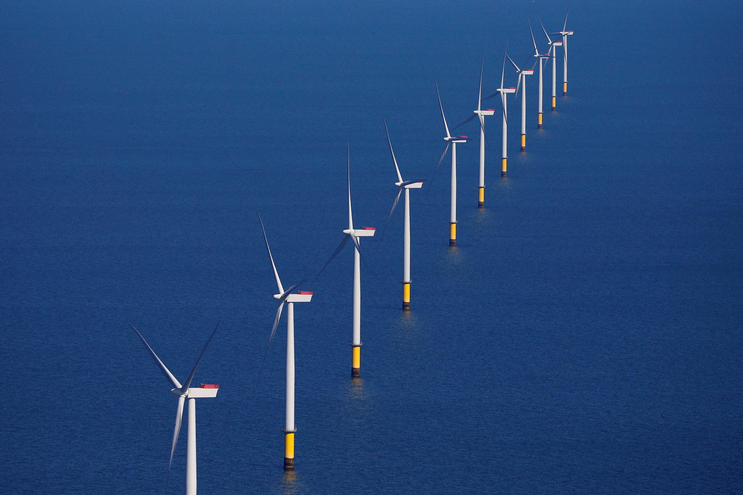 An aerial view of the Walney Extension offshore wind farm operated by Orsted off the coast of Blackpool, Britain.