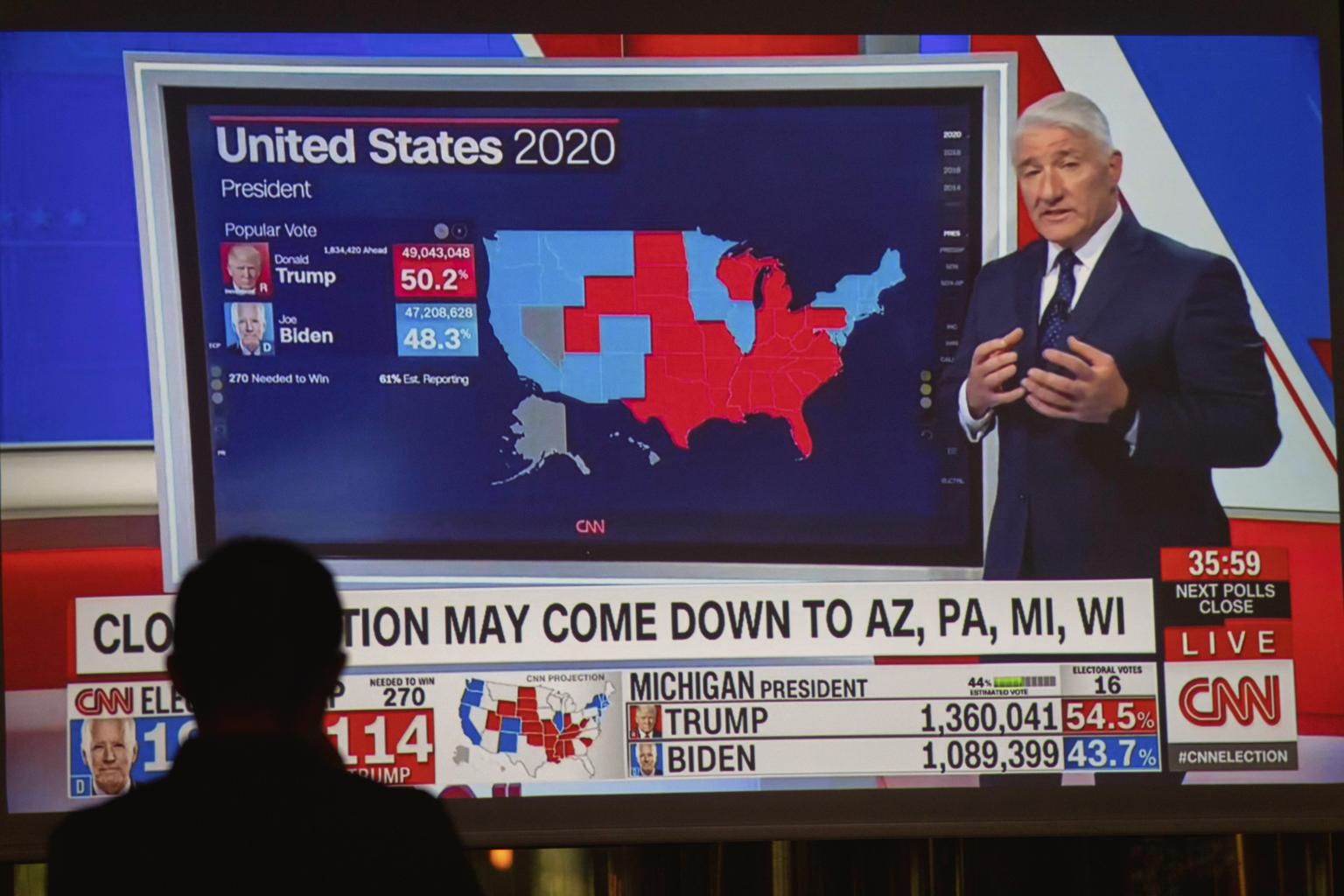 A man follows US elections results on a TV in a restaurant in Shanghai, China, on Nov 4, 2020.