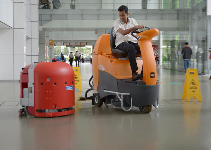 A cleaning robot (left) and a human-operated cleaning machine at NUH, June 27, 2016.
