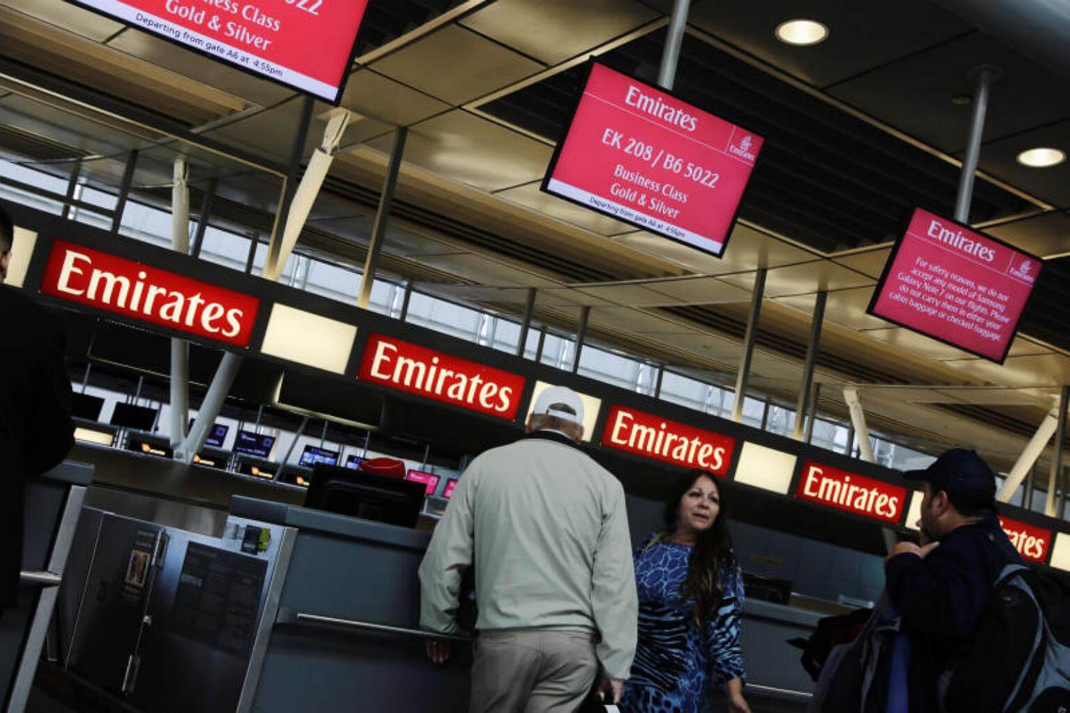 Travelers wait at an Emirates Airlines ticket desk at JFK International Airport in New York, US, on March 21, 2017.