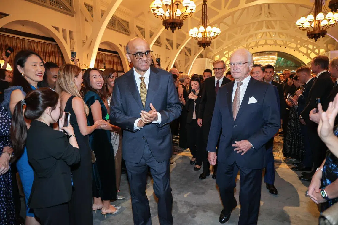 President Tharman Shanmugaratnam and Sweden’s King Carl XVI Gustaf at a gala reception hosted by the latter at The Fullerton Bay Hotel on Nov 20.