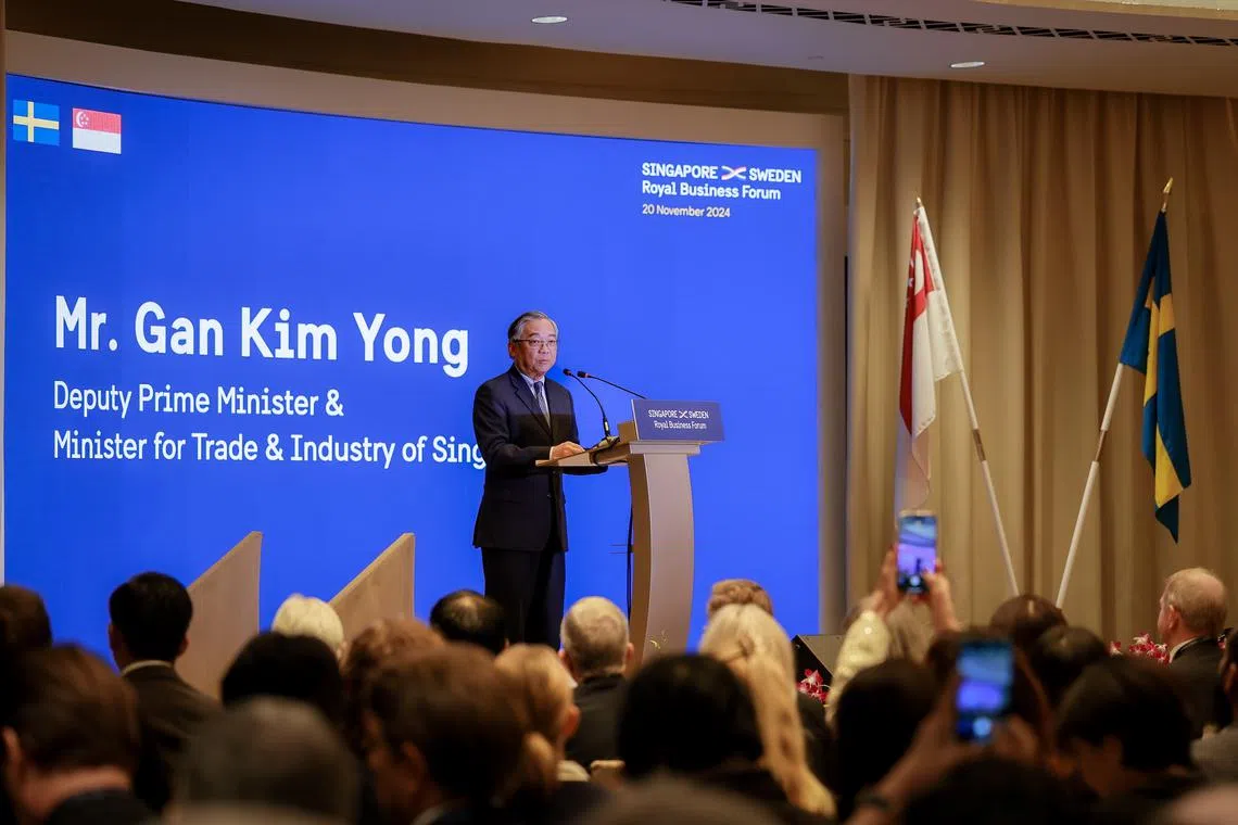 Deputy Prime Minister Gan Kim Yong speaking at the Singapore-Sweden Royal Business Forum, held at the Fullerton Hotel on Nov 20.