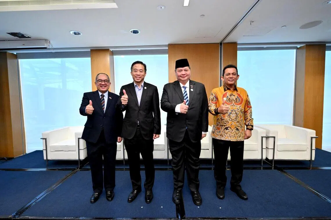 (From left) Indonesia's Ambassador to Singapore Suryo Pratomo, Economic Development Board Chairman Png Cheong Boon, Indonesia's Coordinating Minister for Economic Affairs Airlangga Hartarto, and Governor of the Riau Islands Province Ansar Ahmad at a business forum in Singapore on Nov 18.