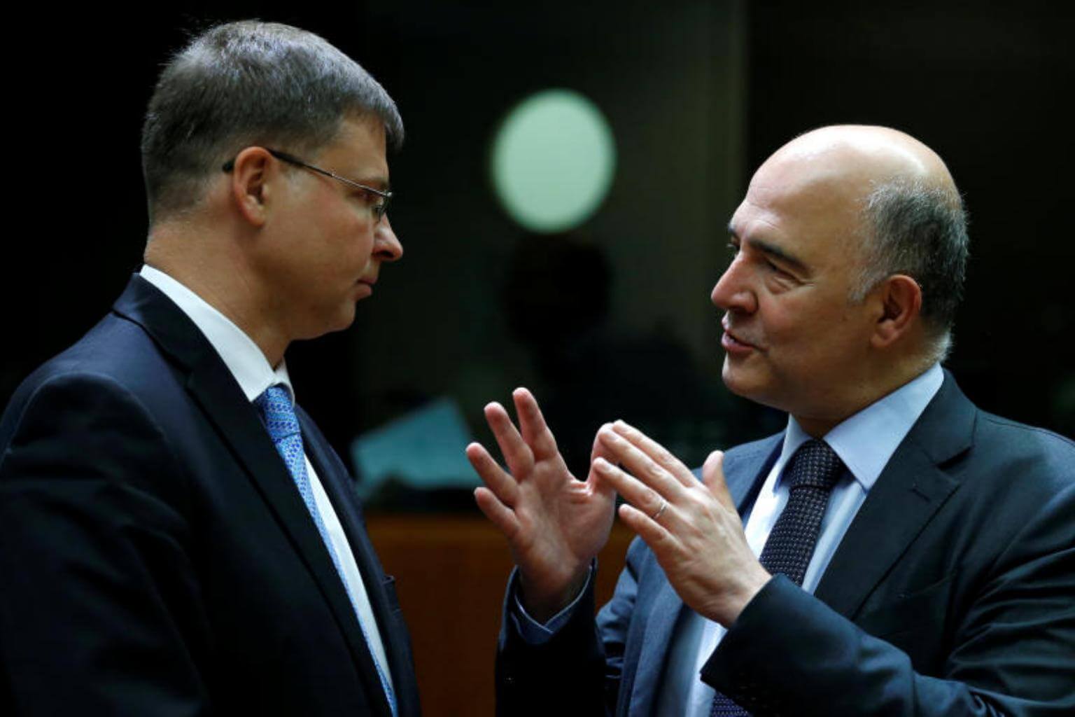 European Commission Vice-President Valdis Dombrovskis and European Economic and Financial Affairs Commissioner Pierre Moscovici attend an European Union finance ministers meeting in Brussels, Belgium, on July 11, 2017.