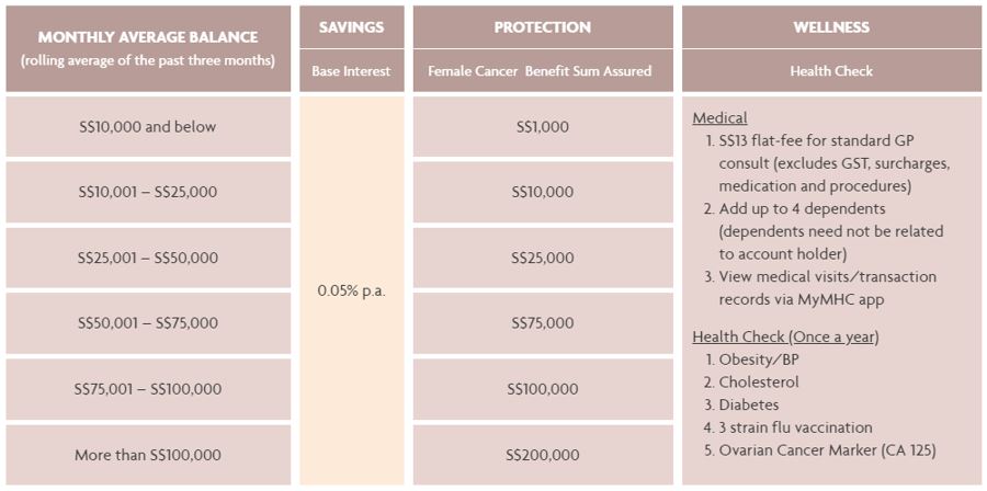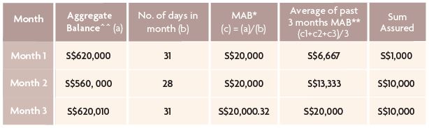 The female cancer benefit of UOB Lady's Savings Account is based on the rolling average of the account holder's MAB in the past three months. See the illustration table below.
