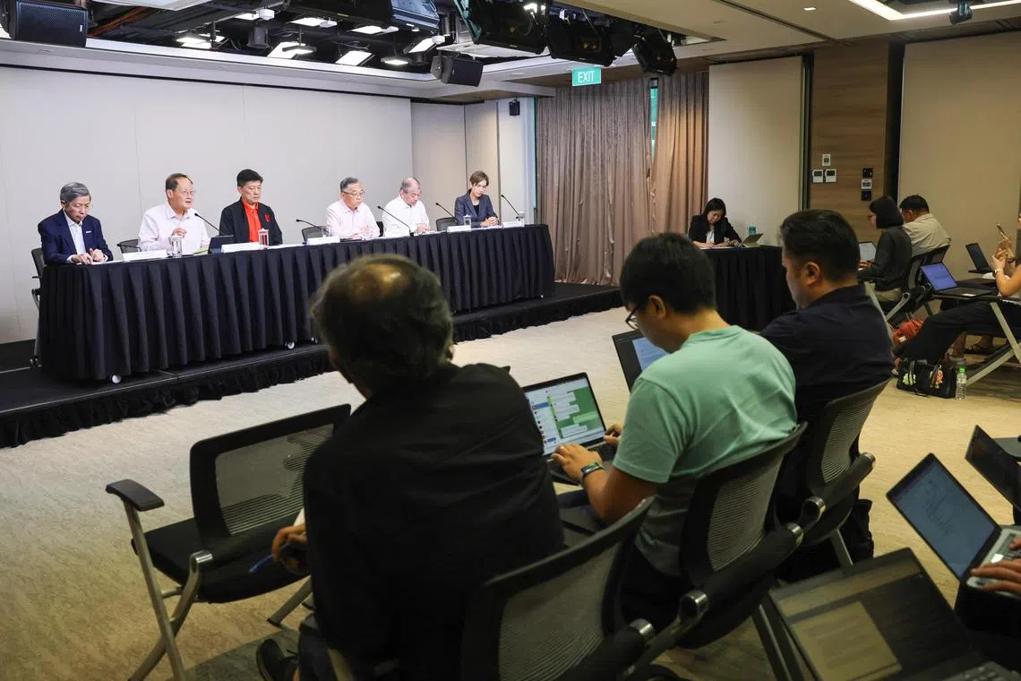 (From left) Singapore National Employers Federation president Tan Hee Teck, Manpower Minister Tan See Leng, NTUC secretary-general Ng Chee Meng, Deputy Prime Minister Gan Kim Yong, Singapore Business Federation chairman Teo Siong Seng and Digital Development and Information Minister Josephine Teo at a press conference on July 10.