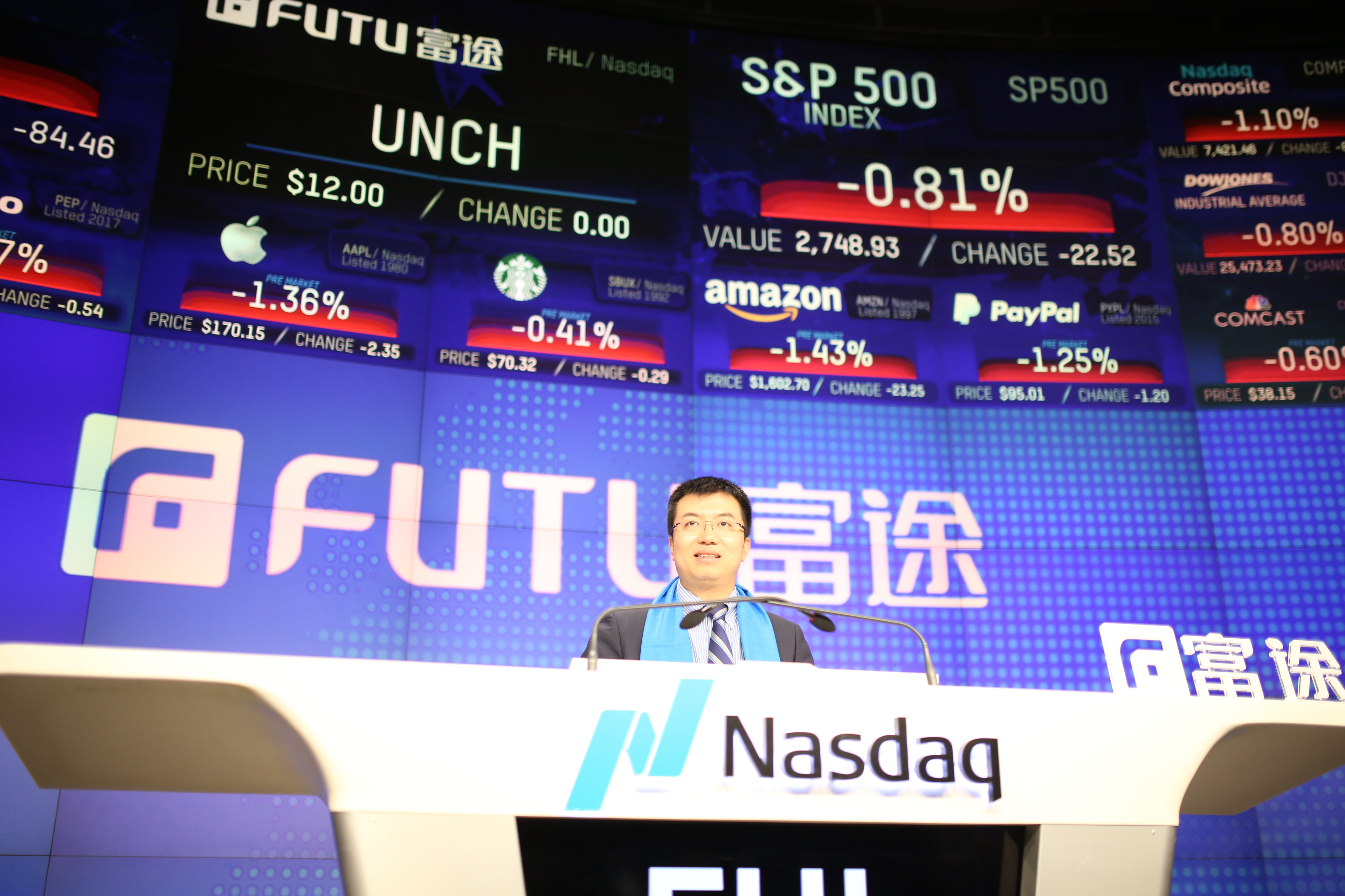 Mr Leaf Li announces Futu’s Initial Public Offering (IPO) on the Nasdaq Stock Market in 2019.