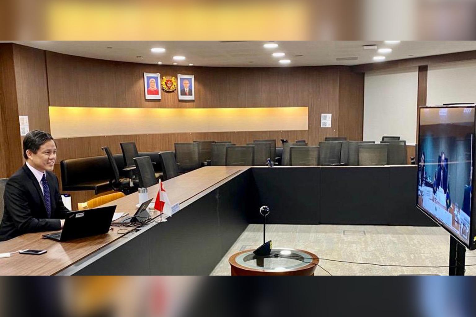 Trade and Industry Minister Chan Chun Sing during a Group of 20 trade ministers meeting, held via video conference, on March 30, 2020.