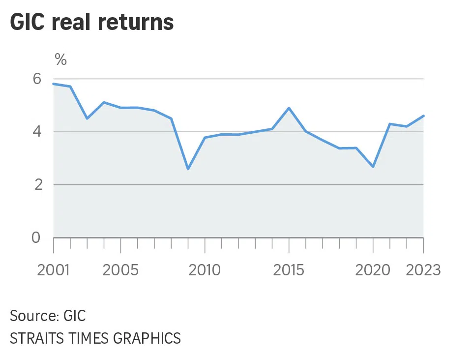This means that over the past 20 years, from April 2003 to March 2023, GIC recorded an average annual return of 4.6 per cent – over and above the global inflation rate, which is in line with its mandate. In doing its calculation, GIC uses the weighted average of inflation in different markets.