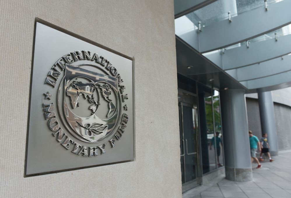 This file photo taken on July 5, 2015 shows the seal of the International Monetary Fund (IMF) at the organization's headquarters in Washington, DC.