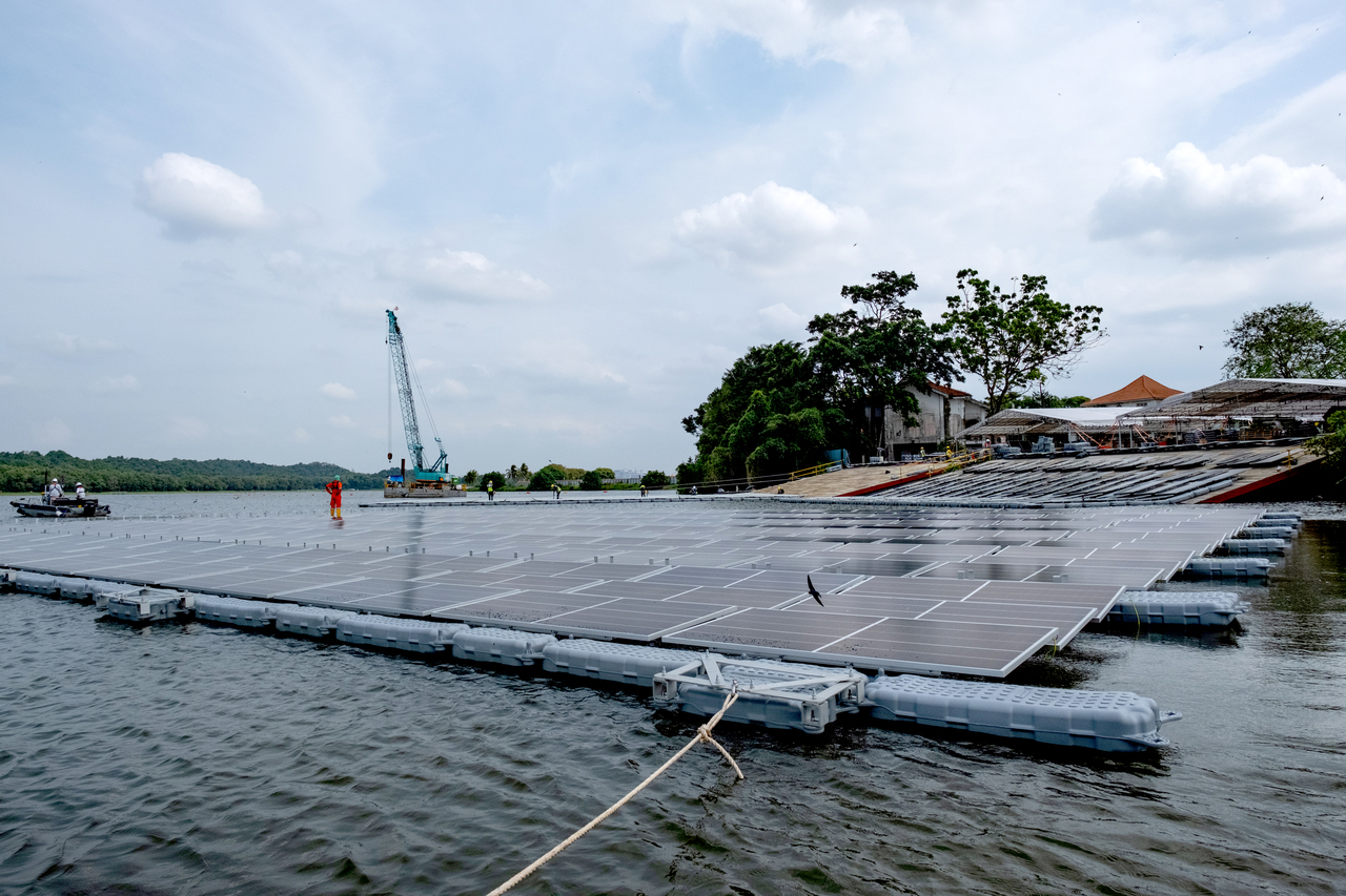 Floating solar panel arrays that have been assembled at Tengeh Reservoir. The project will be able to generate sufficient clean energy to power PUB's local water treatment plants.