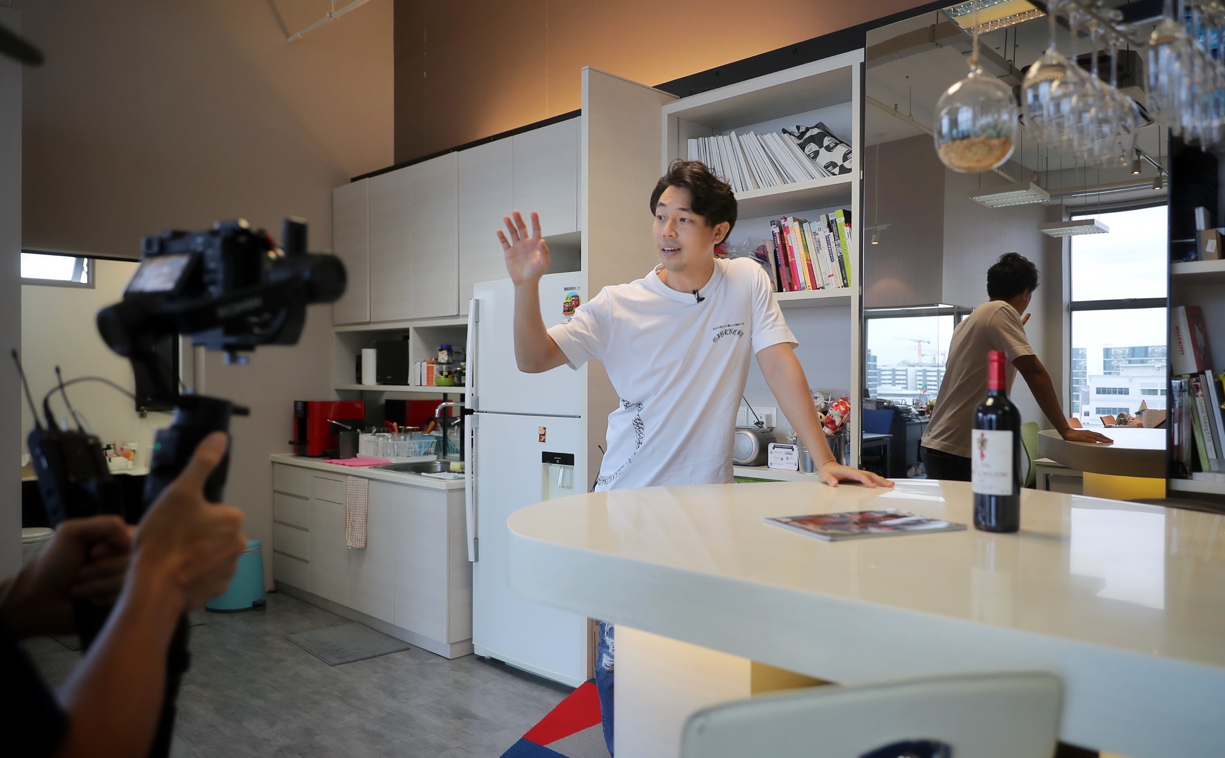 Real estate entrepreneur Nick Tan working on a video featuring an office unit in Paya Lebar that was up for sale early this month.