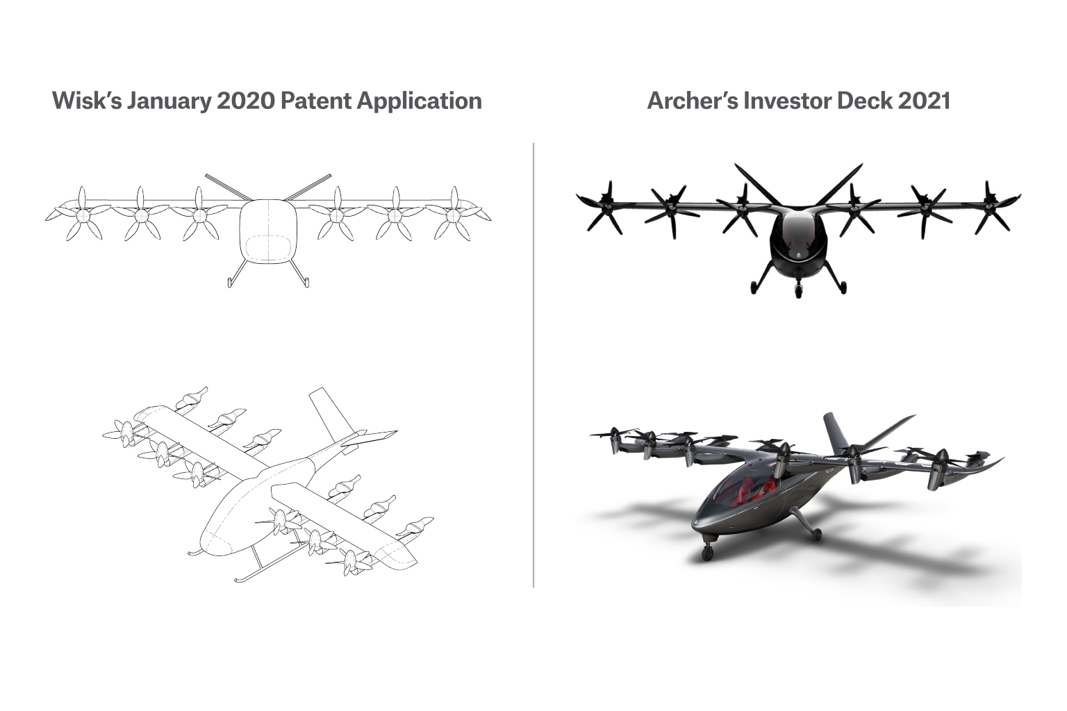 An undated photo showing an image included in a court filing comparing a Wisk prototype (left) with one later produced by Archer.