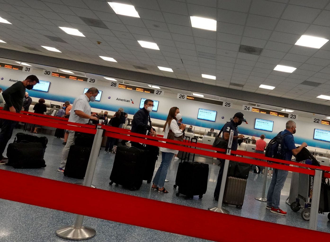 Travellers wait to drop their baggage at Miami International Airport in September 2021.