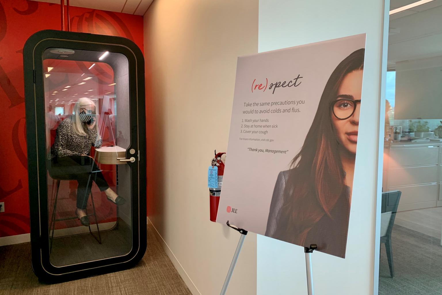 An employee making a call in a newly installed phone booth at real estate company JLL’s office in Austin, Texas. As United States bank employees prepare to return to offices in the coming months because of the pandemic easing, their employers are bringing in tech that monitors them more closely, which is necessary for safety and to save costs.