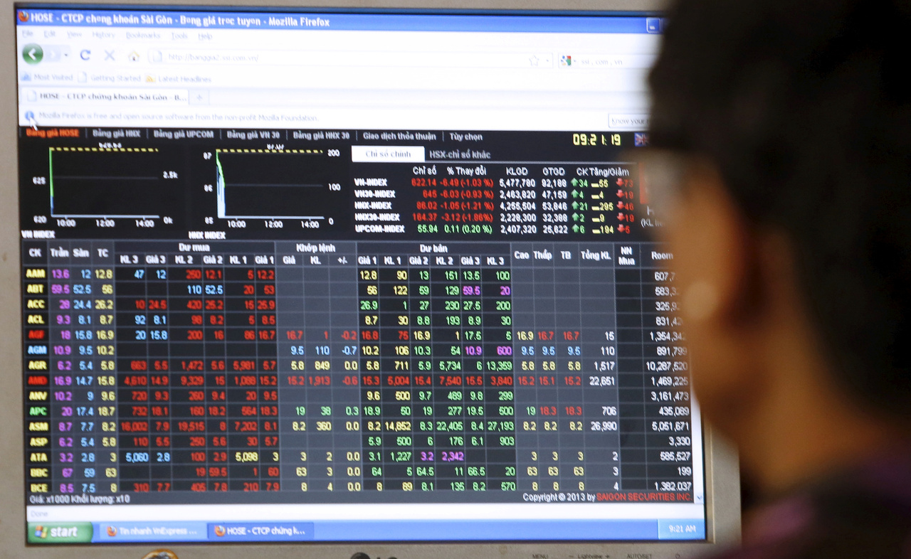 An investor looks at a stock market screen at a securities company in Hanoi, Vietnam on July 20, 2015.