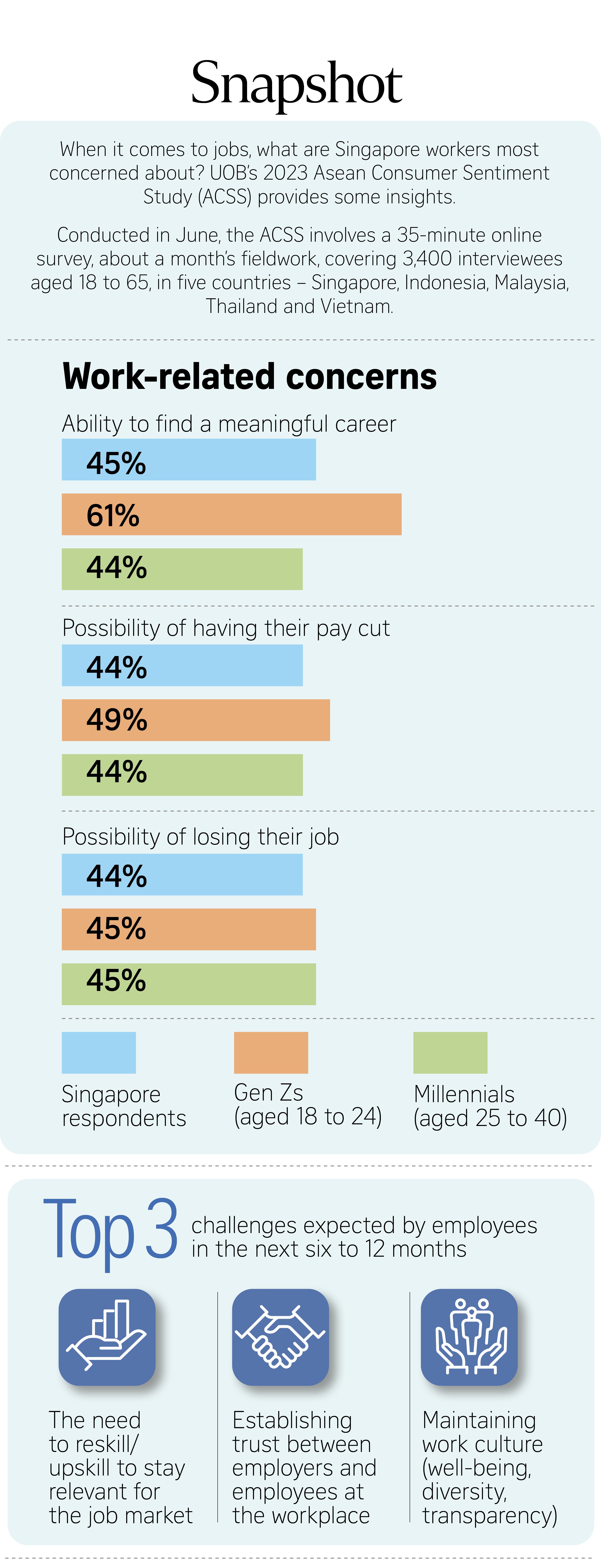 Such expectations seem to reflect a state of flux, especially among Gen Zs in Singapore. UOB’s study found that while just over 60 per cent worry about finding a meaningful career, 45 per cent fear losing their jobs.