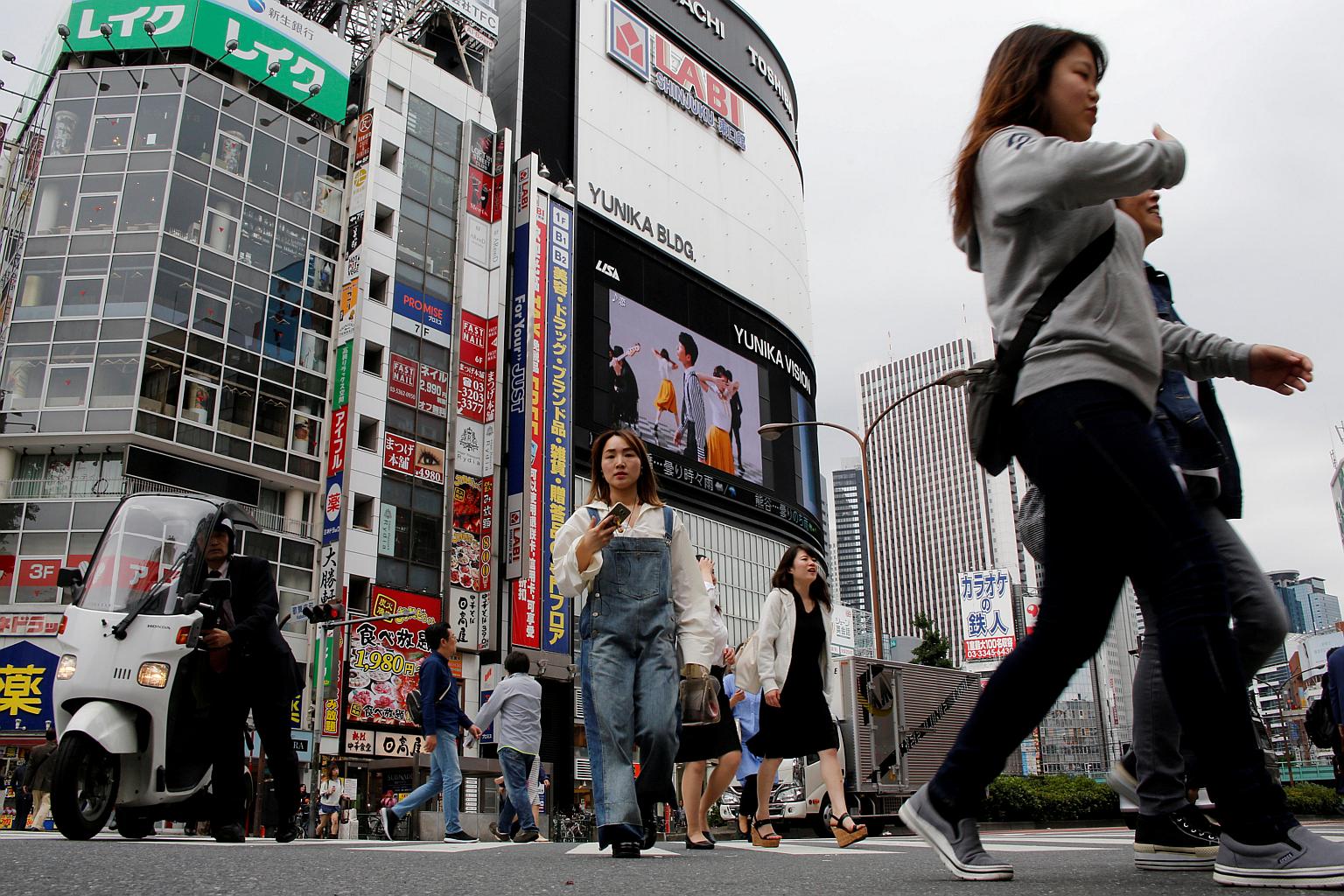 People cross a street in the Shinjuku shopping and business district in Tokyo.
