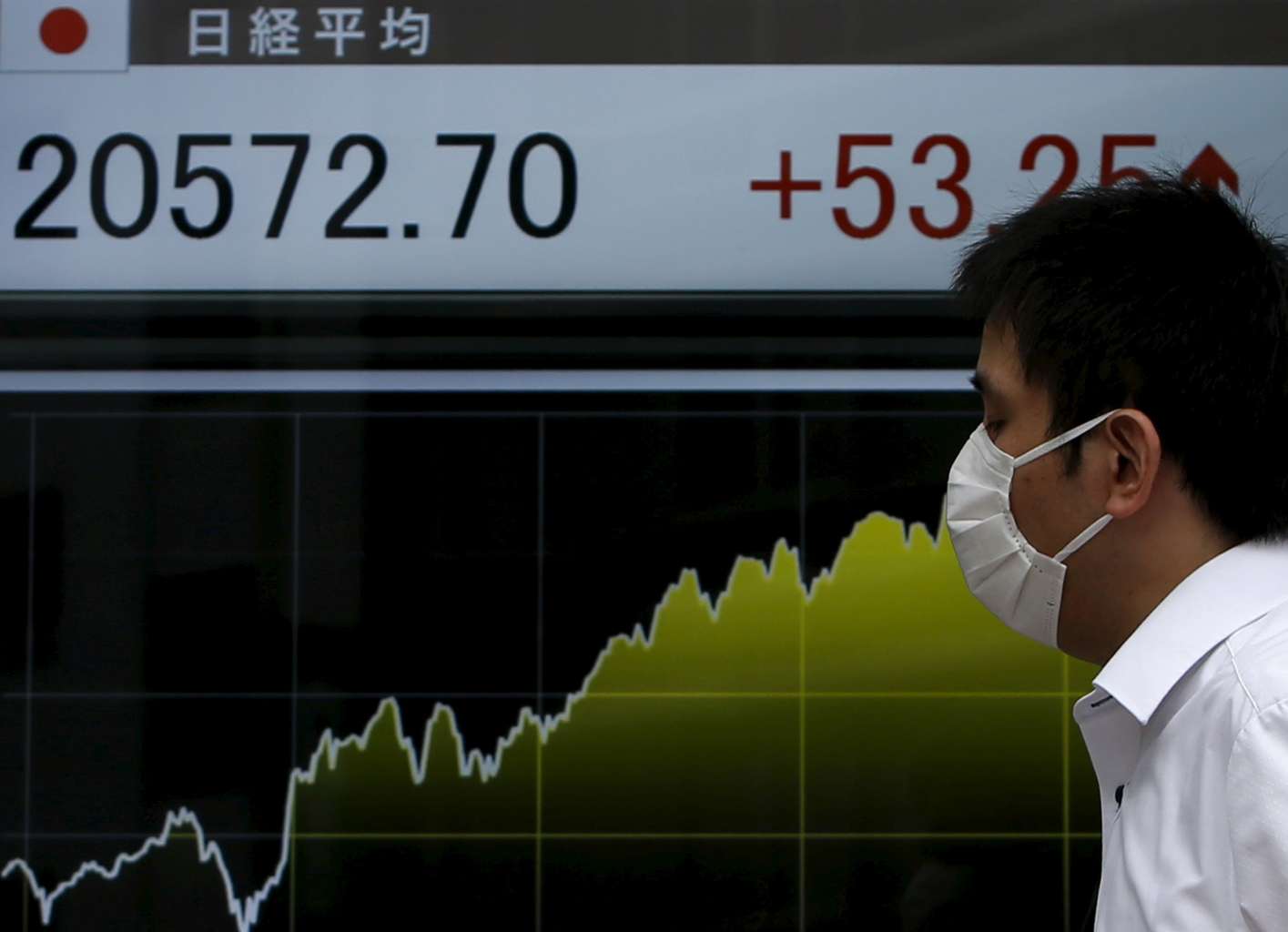A pedestrian walking past an electronic board showing Japan's Nikkei average (top). Japan's deputy economic minister Yasutoshi Nishimura said he expects the yuan devaluation to have 'enormous' potential impact on Japanese markets.