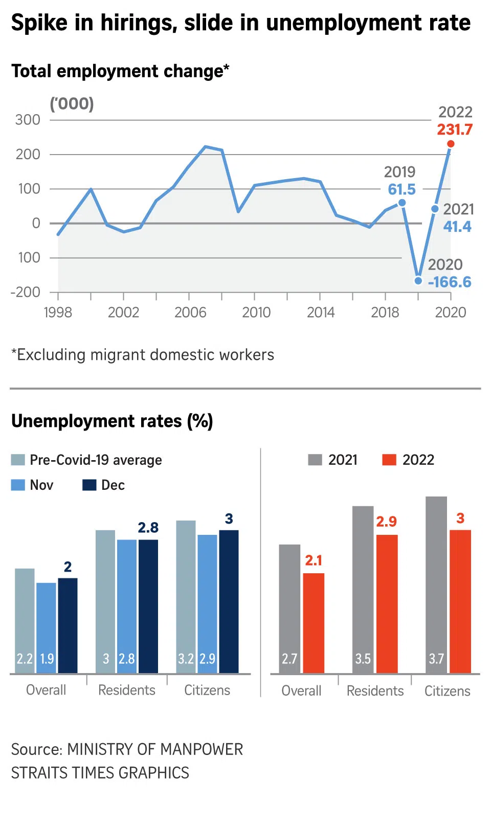 SINGAPORE – The job market ended 2022 with a flourish, with a record 231,700 more workers employed in the course of the year – surpassing the pre-pandemic 2019 numbers by 3 per cent.