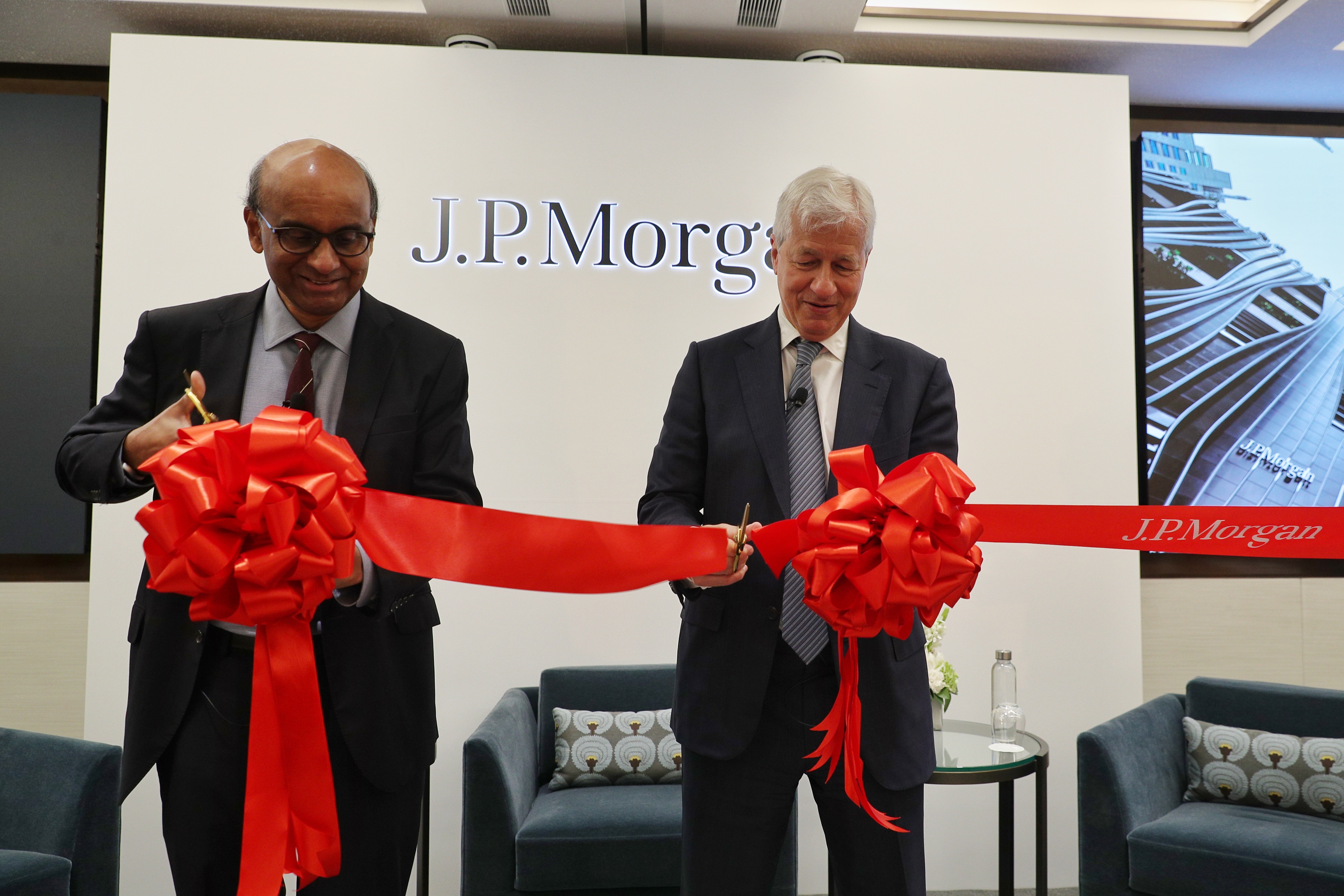 Senior Minister Tharman Shanmugaratnam (left) and JP Morgan chairman and CEO Jamie Dimon attend a ribbon-cutting ceremony at the new JP Morgan office, on June 8, 2022.