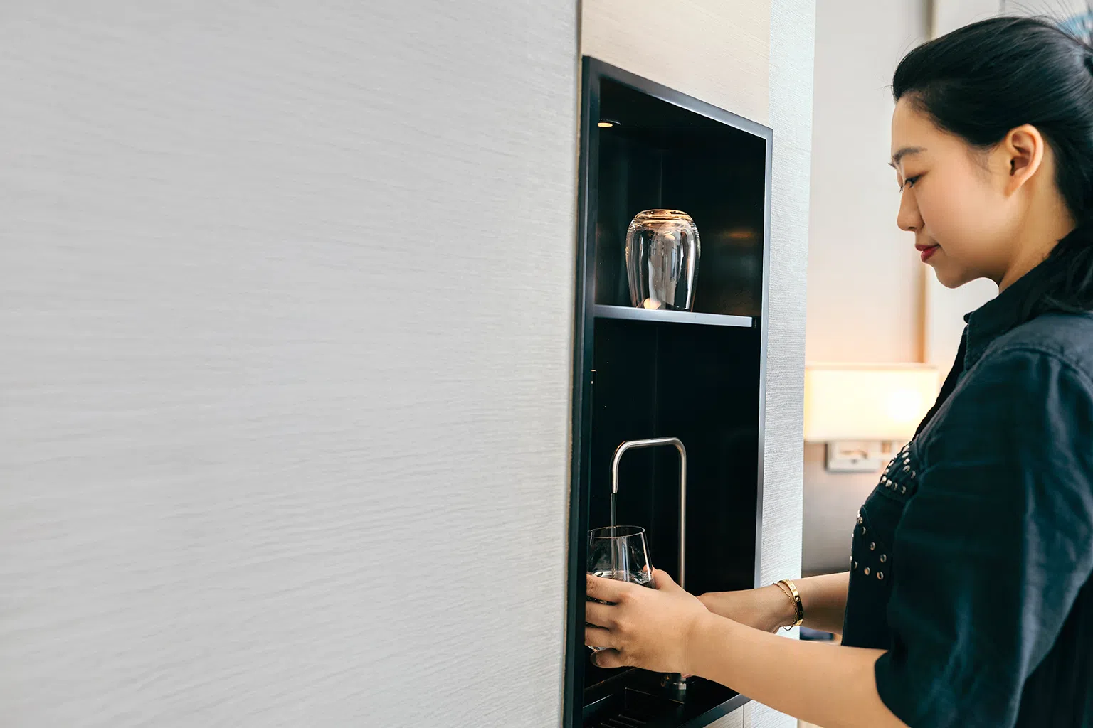 Rooms at Grand Copthorne Waterfront Hotel Singapore feature water filtration systems, eliminating single use plastic bottles while providing guests with drinking water.