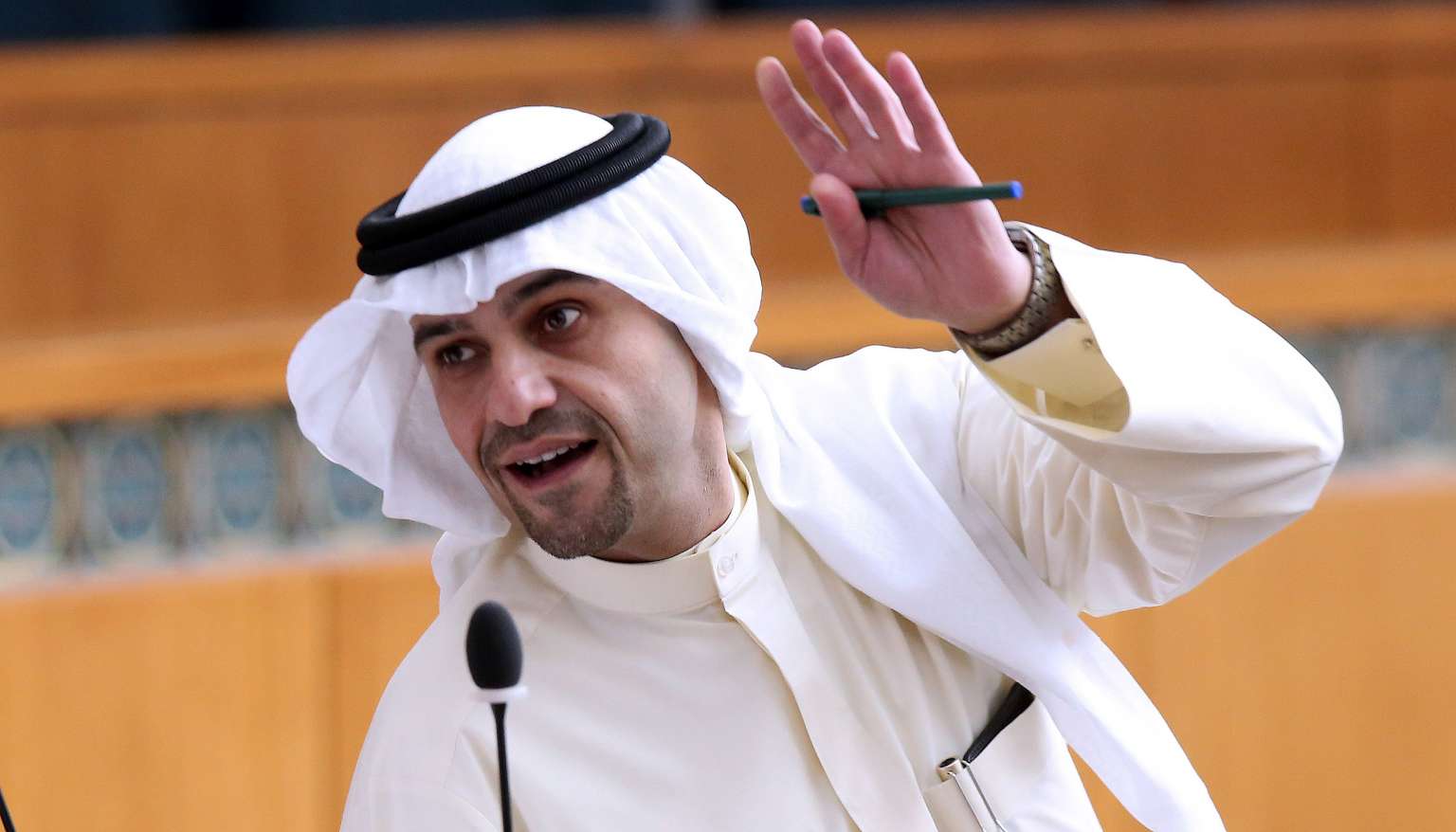 Kuwaiti Oil and Finance Minister, Anas al-Saleh waves during a parliamentary session on June 21, 2016 at the national assembly in Kuwait City.