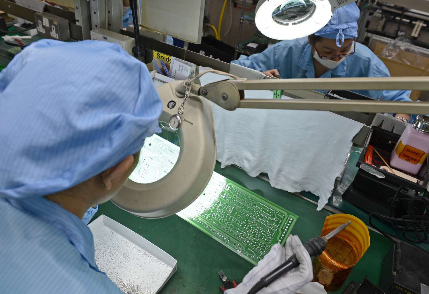 Workers at Add-Plus, an electronics manufacturing company that makes printed circuit boards.