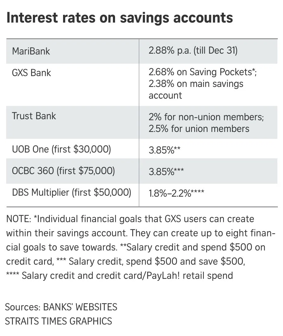 MariBank’s 2.88 per cent promotional offer is also higher than what DBS Multiplier customers can get when they credit their salary and card spend, but lower than what UOB One and OCBC 360 customers are getting.