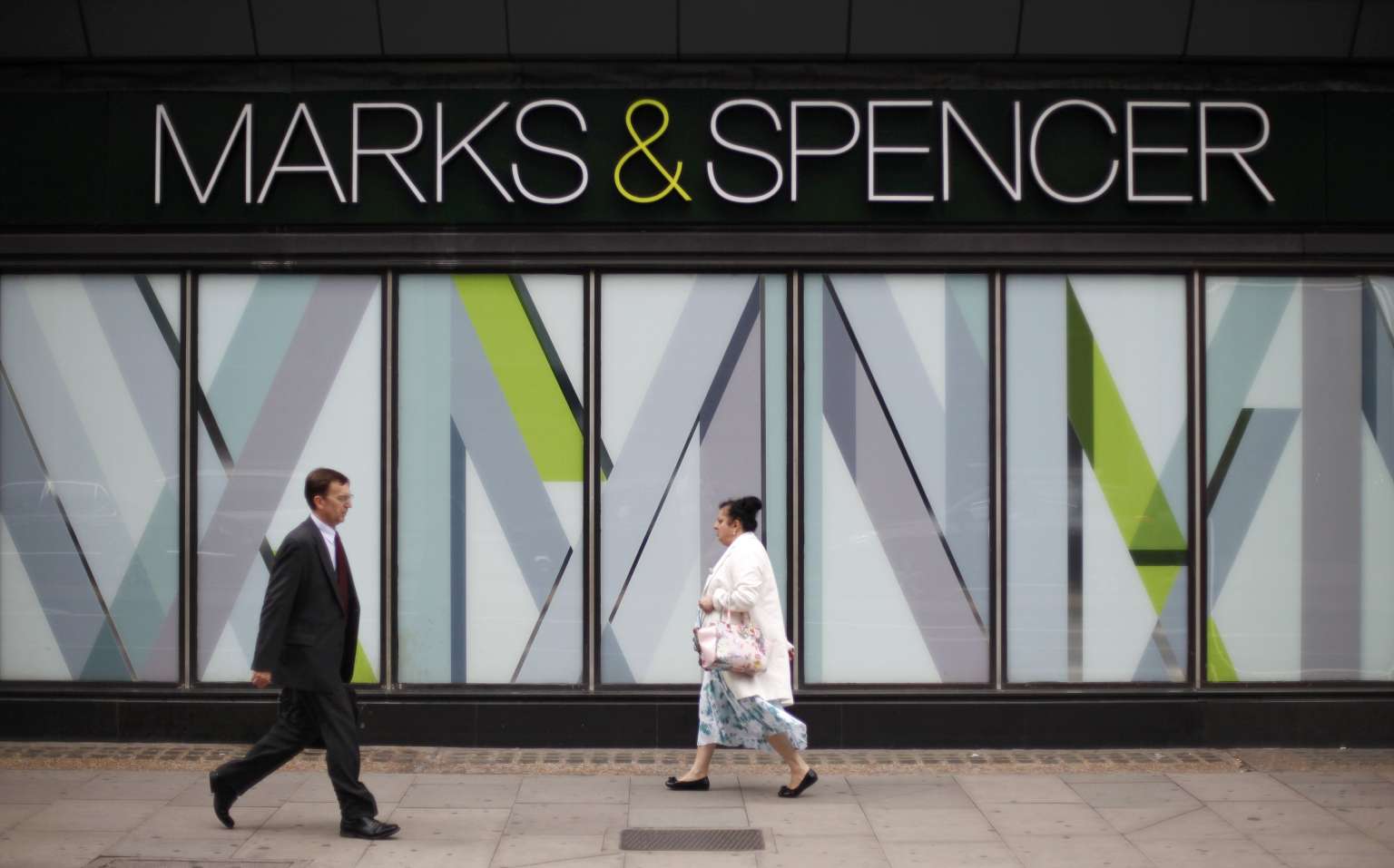 Pedestrians walk past a branch of Marks & Spencer in north-west London, Britain.
